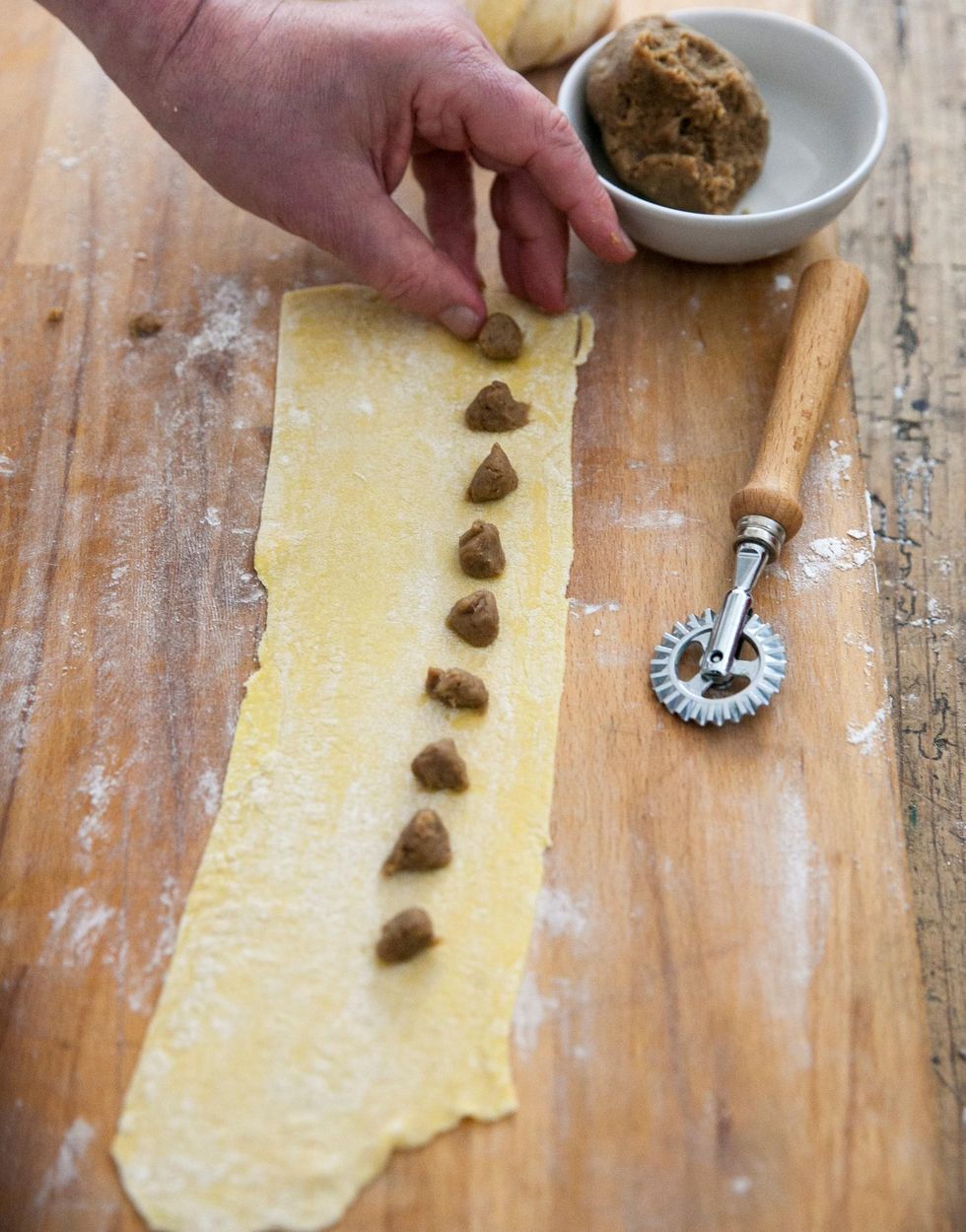 Mix the meat with the egg, half parmesan, a grated nutmeg, salt, and pepper. Arrange some of the mixtures in the middle of half the squares of dough, cover with the other squares and seal the agnolotti.