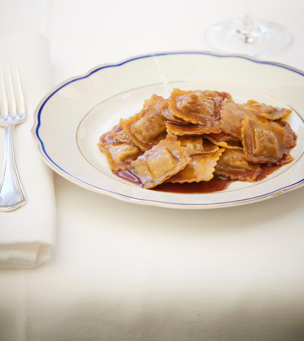 Mix the agnolotti with the remained sauce of the roast. Complete with a thyme leaf and serve.