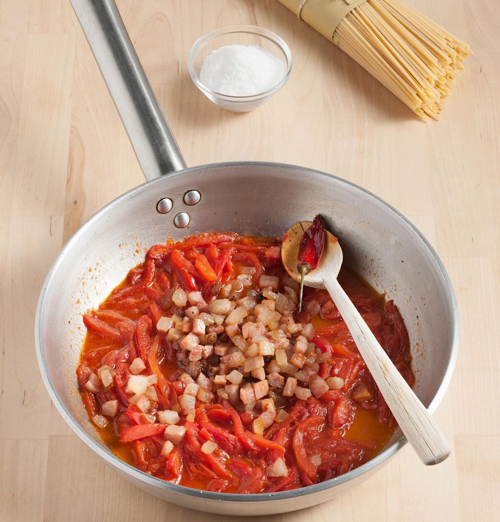 The amatriciana is a typical sauce of Italian cuisine, and it's usually used with pasta. It has a strong and determined taste, and it takes the name of a small town in the center of Italy, Amatrice. This typical sauce is based on tomatoes, guanciale (an Italian cut of pork's jowl, but similar to bacon), and fresh pecorino.