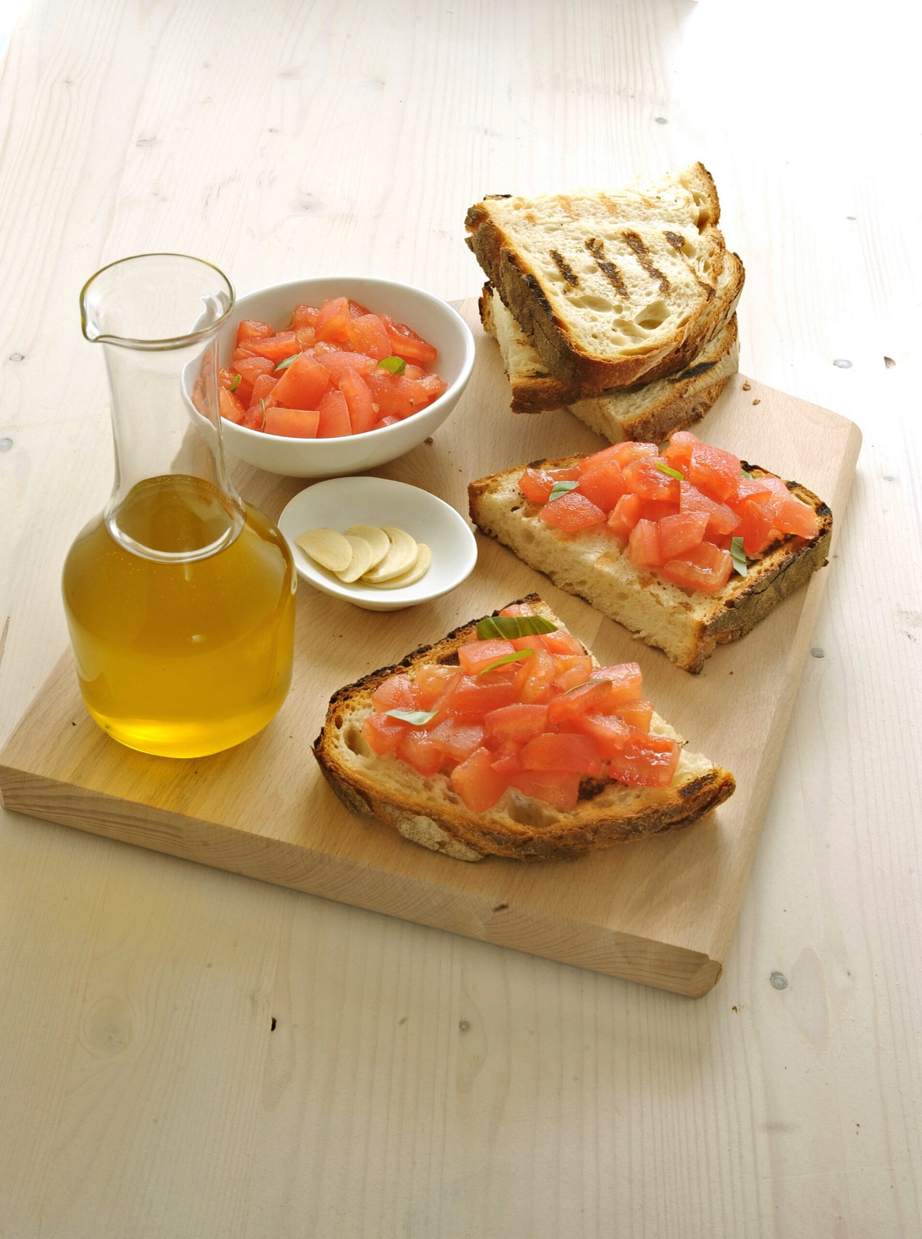 Bruschetta is a word of Lazio origin, but used above all in Tuscany, referring to a slice of toasted bread, rubbed with a clove of garlic and seasoned with salt, pepper, and extra virgin olive oil.