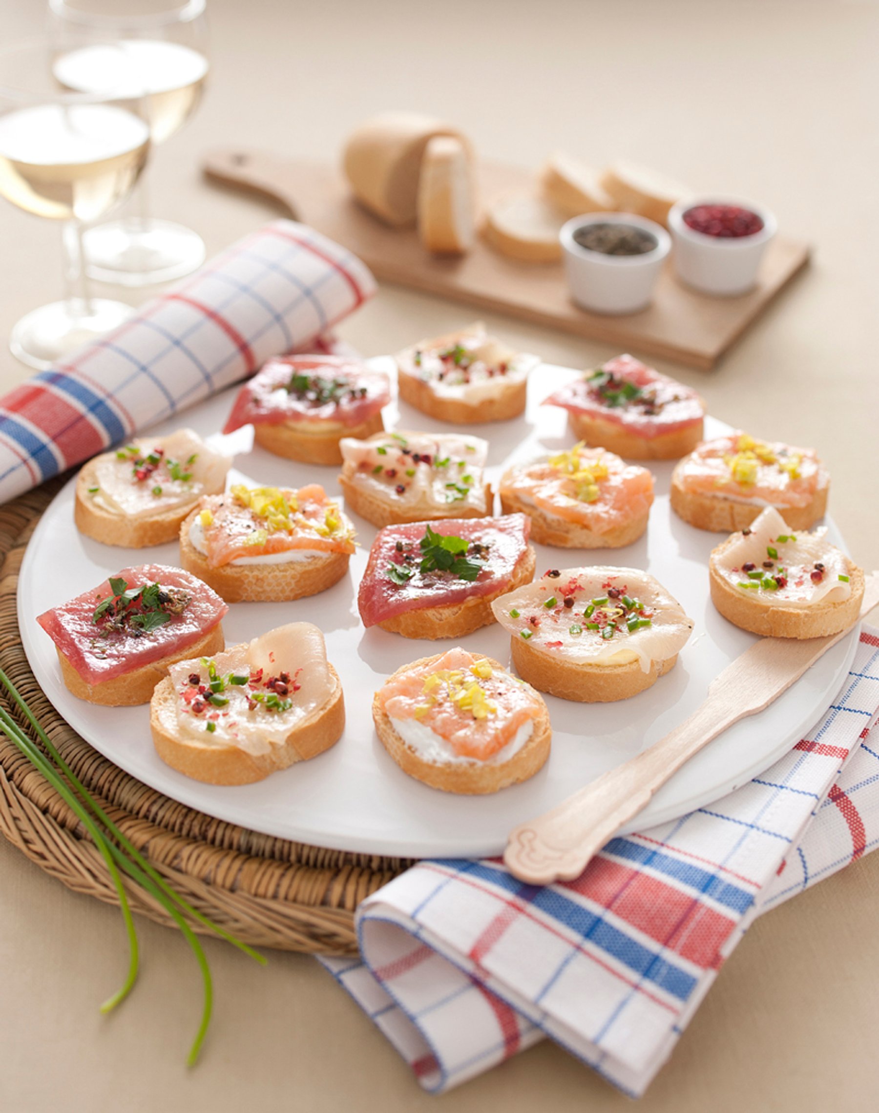 The canapé consists of a slice of bread (usually pan loaf) cut rather thinly, buttered or spread with mayonnaise and variously coated (with ham, cheese, shellfish, caviar, smoked salmon, etc.).