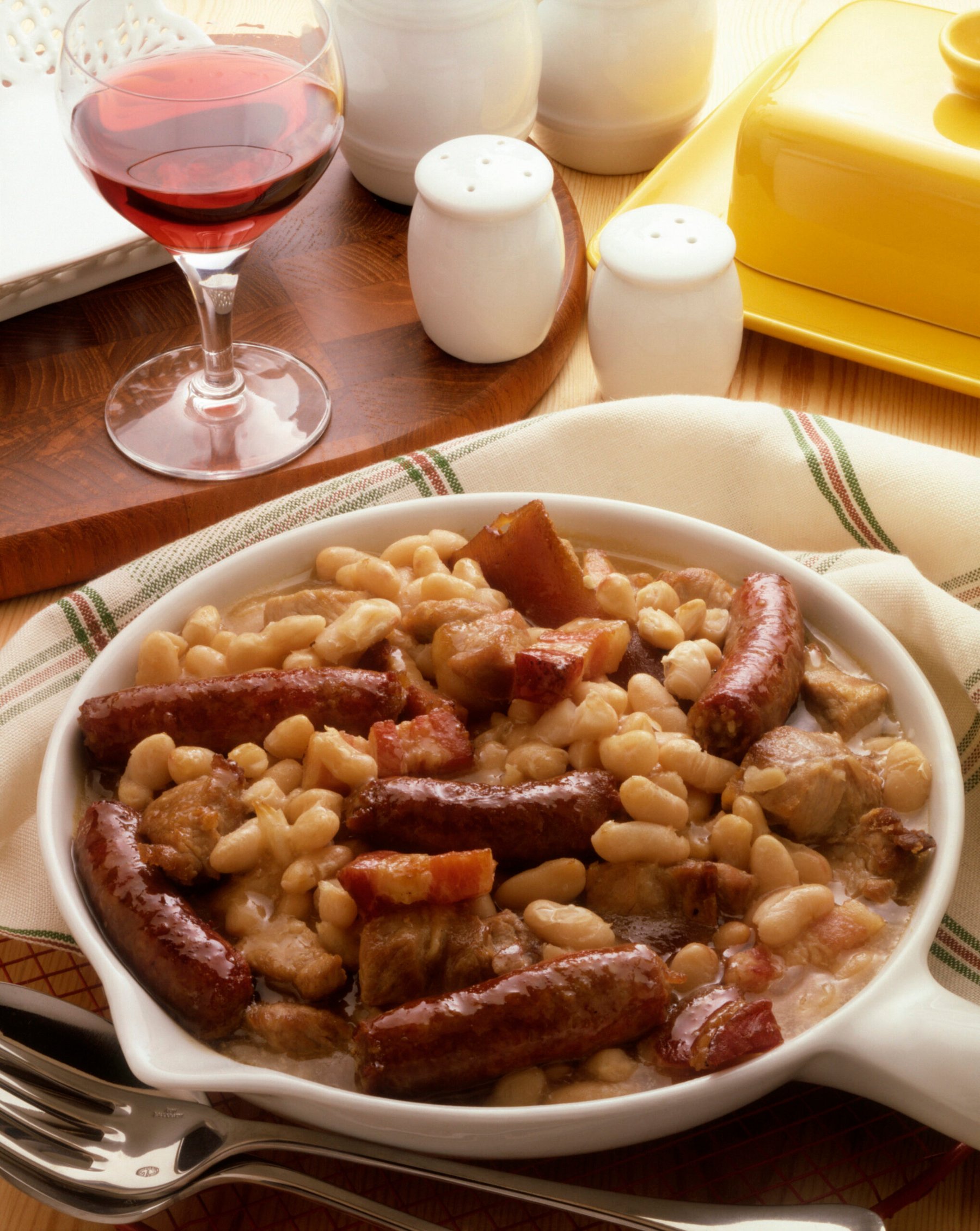 Cassoulet is a typical dish of the region of Languedoc in France. It is essentially a stewed preparation, based on lamb or mutton, confit d'oie (goose meat preserved in fat), pork rinds, sausages and white beans (called "mounjetos"), the latter give the preparation an unmistakable taste as well as a slight oiliness. Its name derives from "cassole", the painted terracotta container in which it is prepared.