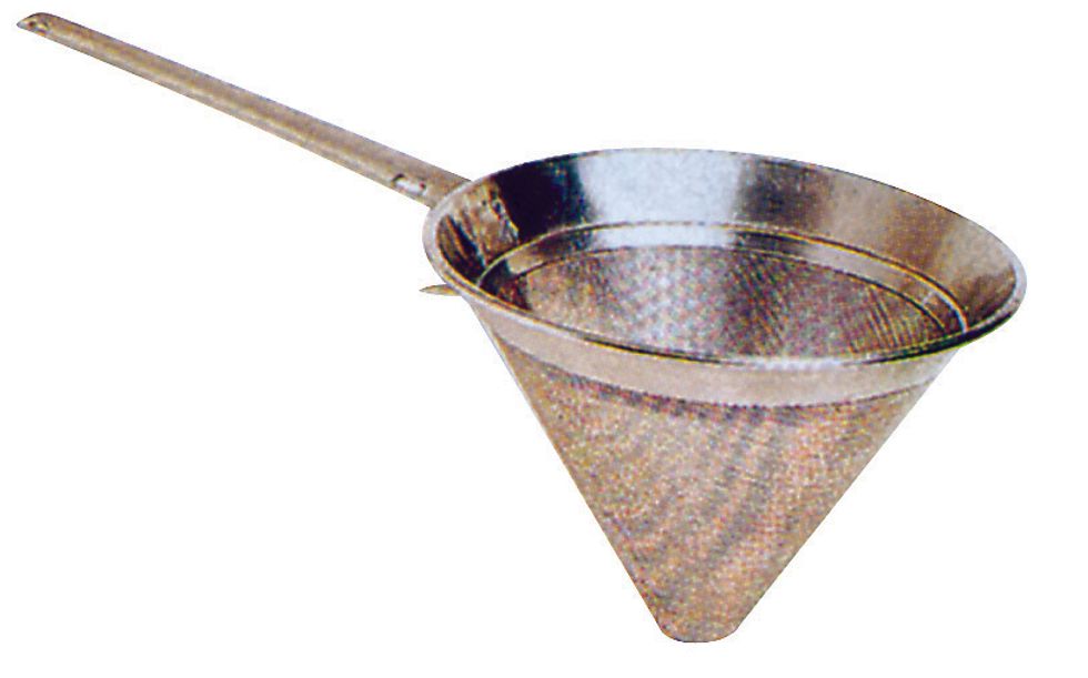 The chinois is a conical shaped colander with a long handle. It exists in two different versions: one with a very dense metal mesh (to filter broths, sauces and creams that must be fine and velvety) and another with a slightly wider metal mesh (used to pass thicker sauces). It is used with a pestle, which helps in eliminating any lumps remained.