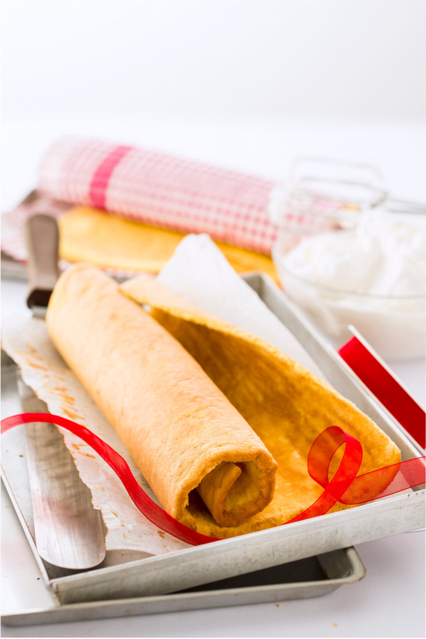 - Roll up the dough with the help of a cloth and leave it to cool. Then reopen it, stuff it as you like and roll it up again.