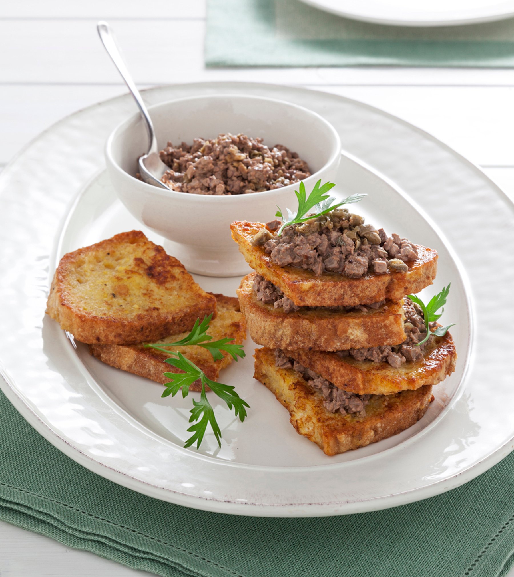 Crouton is a term used to define different preparations: a small nut of fried or toasted bread that is served with a broth or a pureed soup (in this case the term is used in the plural, that is, croutons); a slice of loaf or homemade bread covered with one or more ingredients and passed in the oven to heat, and finally a slice of homemade bread, especially the Tuscan one, spread with a mixture of giblets (calf liver, spleen or game entrails), flavoured with anchovies and finely chopped capers.