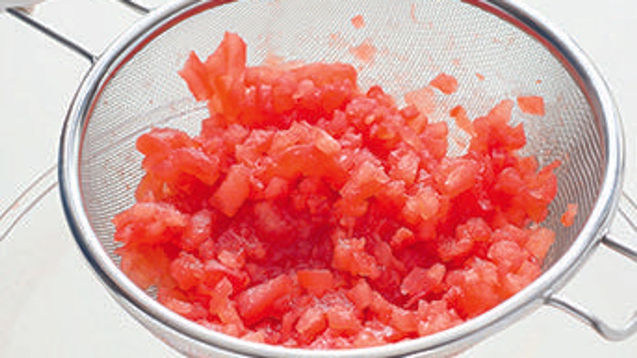 Wash the tomatoes and boil them for a few seconds in boiling water; then drain, peel and chop them coarsely, removing as many seeds as possible. Meanwhile, peel and slice the garlic. Clean, wash and chop the basil.