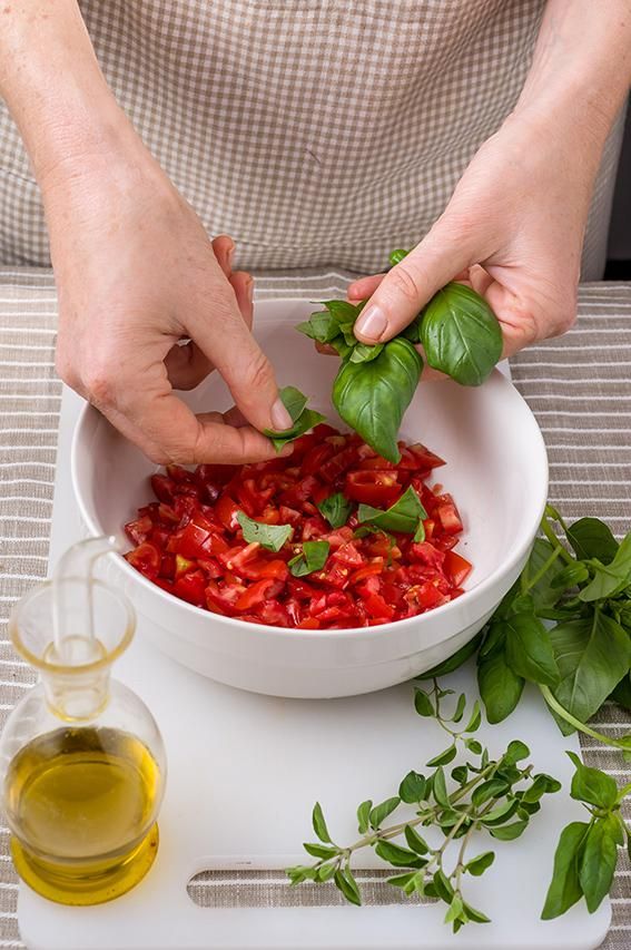 Peel and slice the garlic. Clean, wash and chop the basil. Gather the chopped tomatoes in a bowl, add the sliced garlic, chopped basil, a pinch of oregano, salt, pepper and oil. Mix well, cover the bowl with foil and let the sauce steep for an hour, so it can also cool.