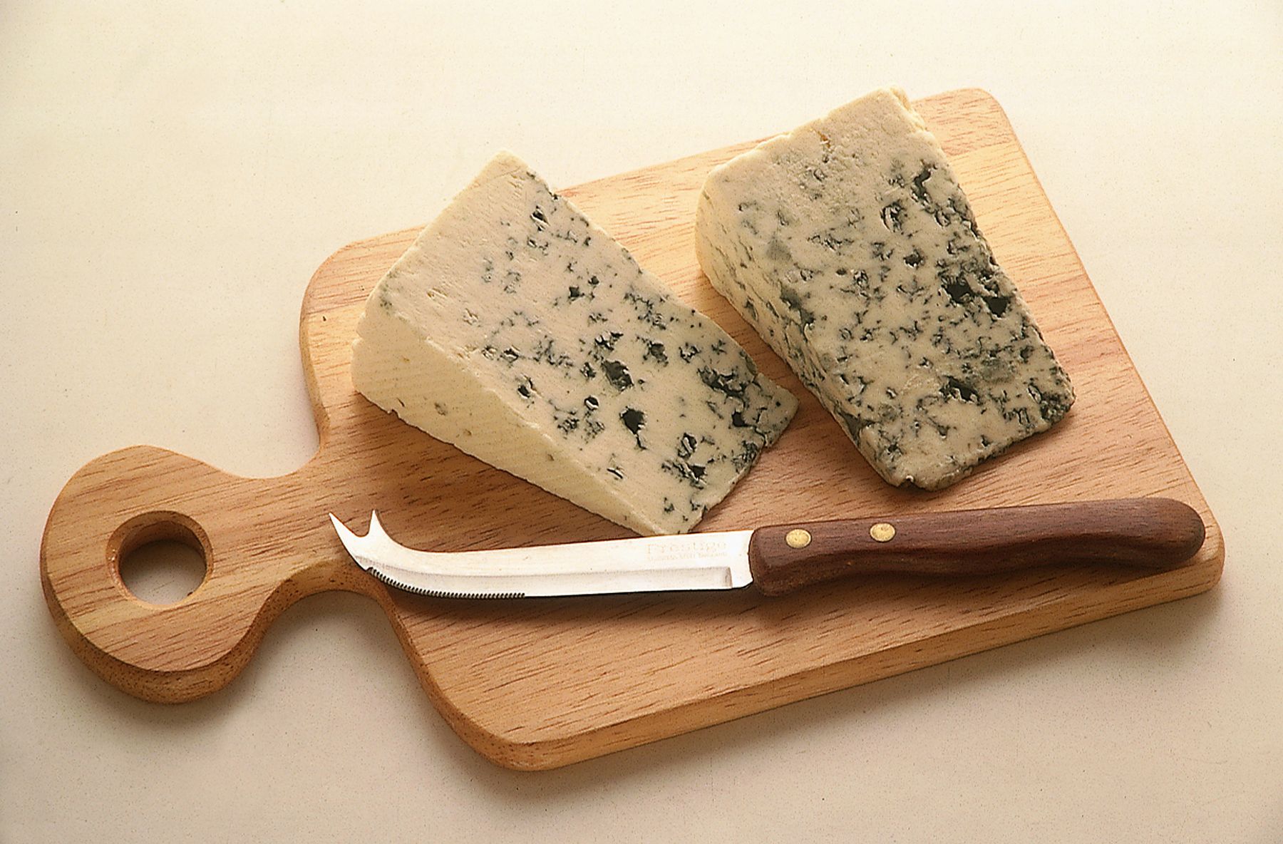 Danablu is a Danish cheese made with cow's milk, which is characterized by a whitish rind and blue paste with greenish hues caused by the development of mold. It is similar to Roquefort but spicier. Its forms weigh about three kilos and have a diameter of 20 cm as well as a thickness of about 10 cm. Danablu is an excellent table cheese (about 45% fat content), but its strong flavor makes it suitable also for sauces.