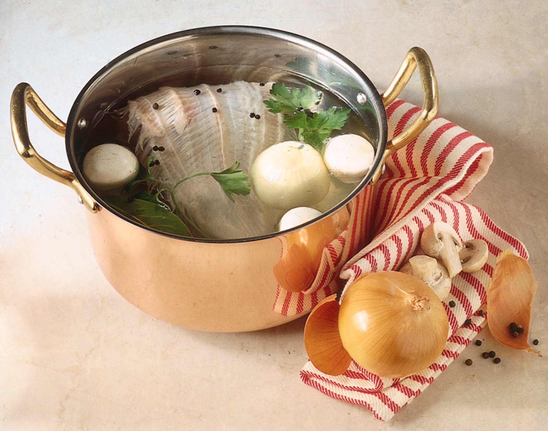 Fish broth is a restricted broth prepared fish scraps (heads, bones, skins), white wine and vegetables. Slowly cooked and then well filtered, this type of broth is used in the preparation of fish-based sauces.