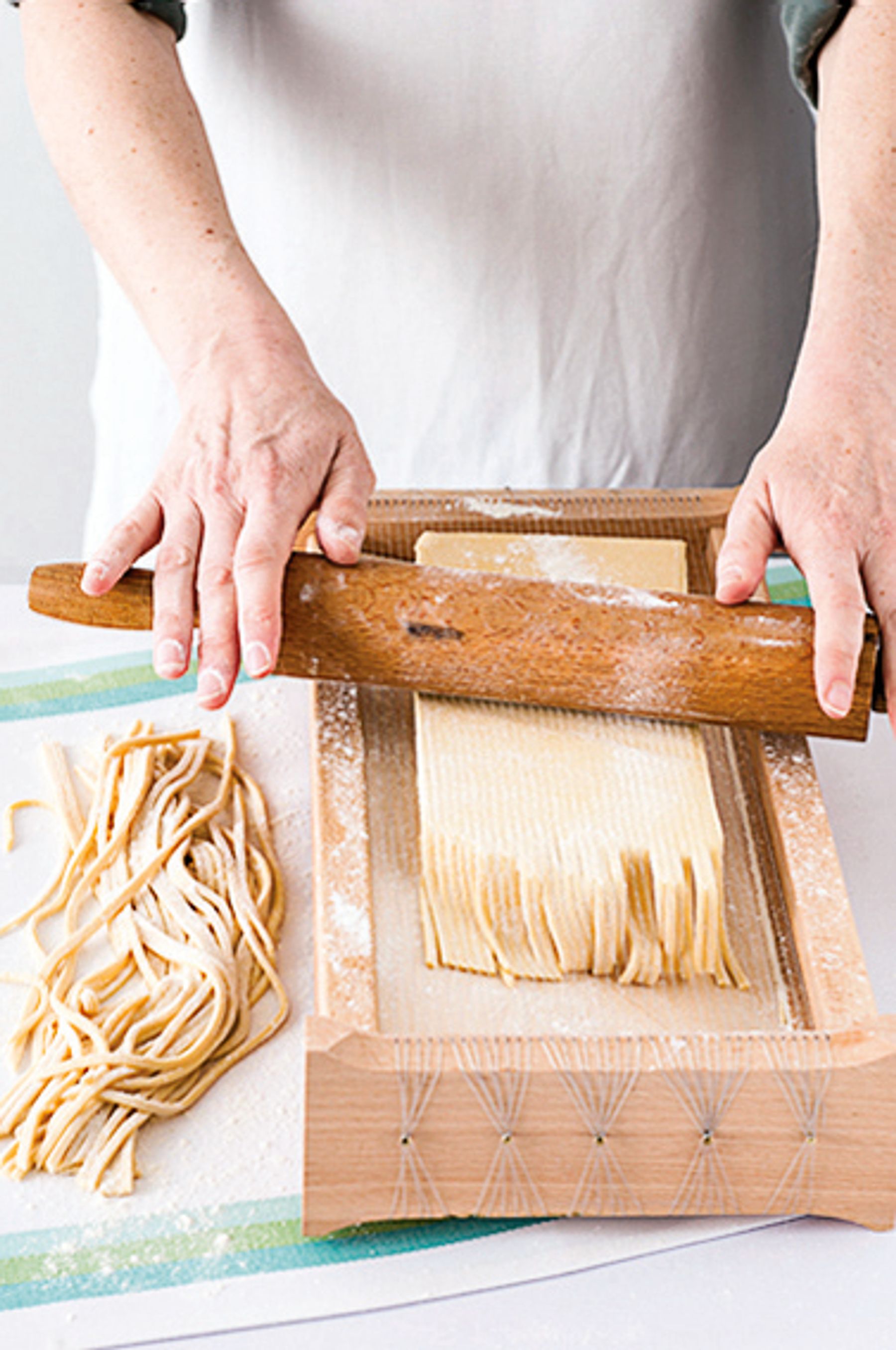 It is a wooden frame, in which thin metal wires are stretched (just like the strings of the guitar), spaced no more than 3-4 mm. The sheet of pasta is placed on top of these threads and pressed with a rolling pin: square spaghetti are thus formed, then seasoned with a meat sauce, in particular mutton and pecorino.