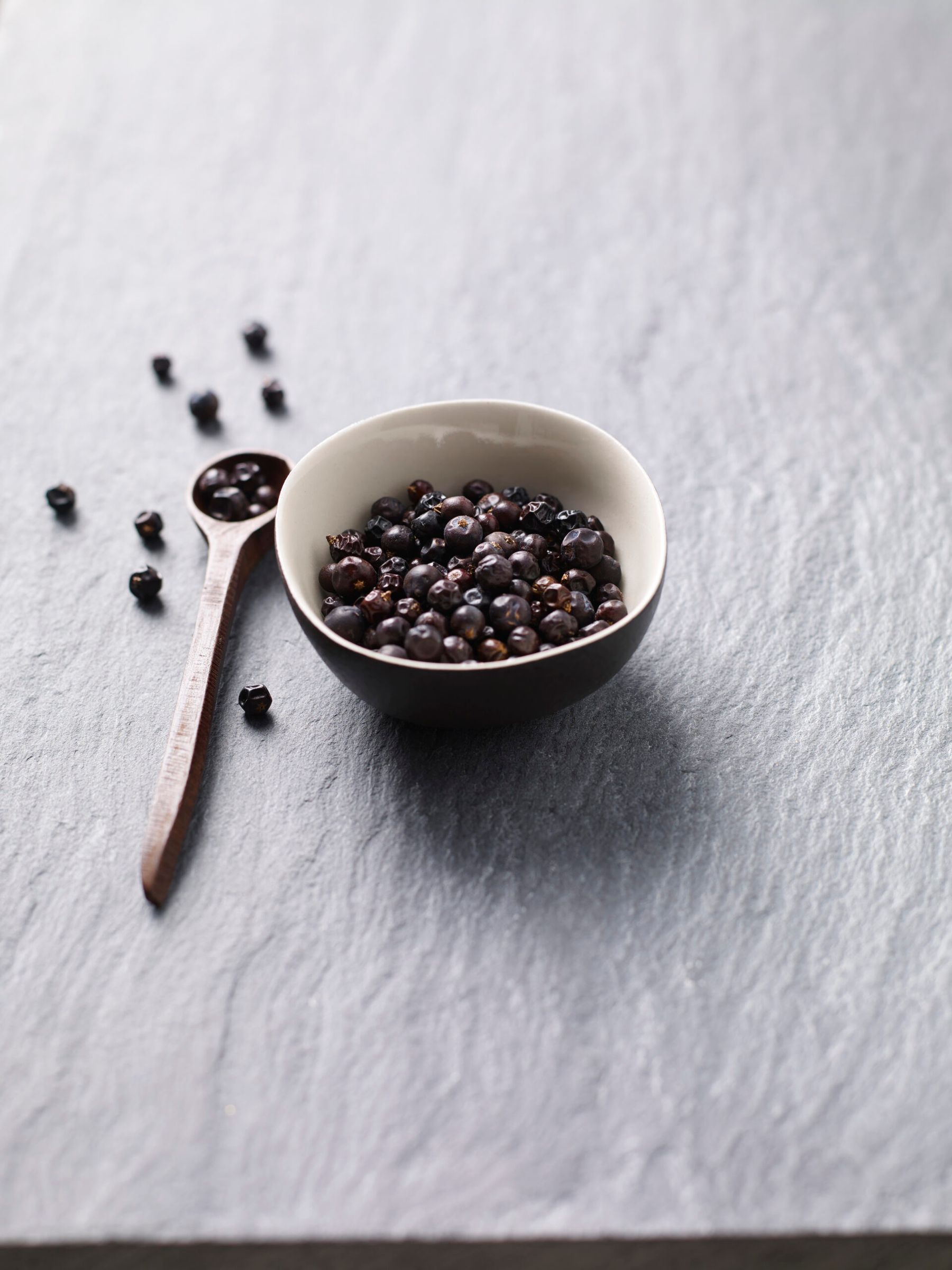 Juniper is a shrub that grows spontaneously in mountainous areas and along the coasts. The marine juniper has the shape of a sapling, while the mountain one grows in bushes. Its leaves are needle-like, green-blue in color and its fruits, when fully ripe, consist of fleshy, small, rounded berries, blue-black in color and covered with waxy substances. Juniper is used in liqueurs for the preparation of gin and in the kitchen to flavour marinades as well as dishes of game and birds; its taste also goes well with lamb. Juniper berries quickly lose their aroma so they must be used fresh, as a matter of fact to best exploit their scent, it is advisable to crush them before using them.
