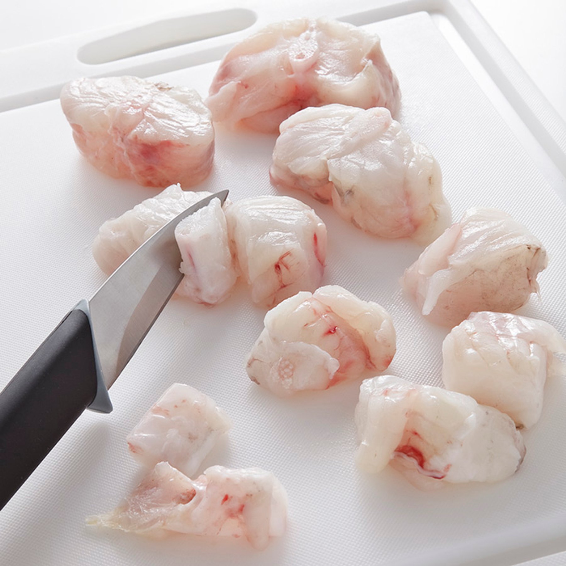 It has pink, lean and fine flesh that turns white when cooked and tastes similar to lobster. A fresh monkfish is recognizable by its shiny flesh which has to be also fairly elastic (neither soft nor too firm, because, in this case, it would reveal a recent thawing). In slices, it can be cooked in a pan with herbs and sauces or in soups, while whole it can be roasted.
