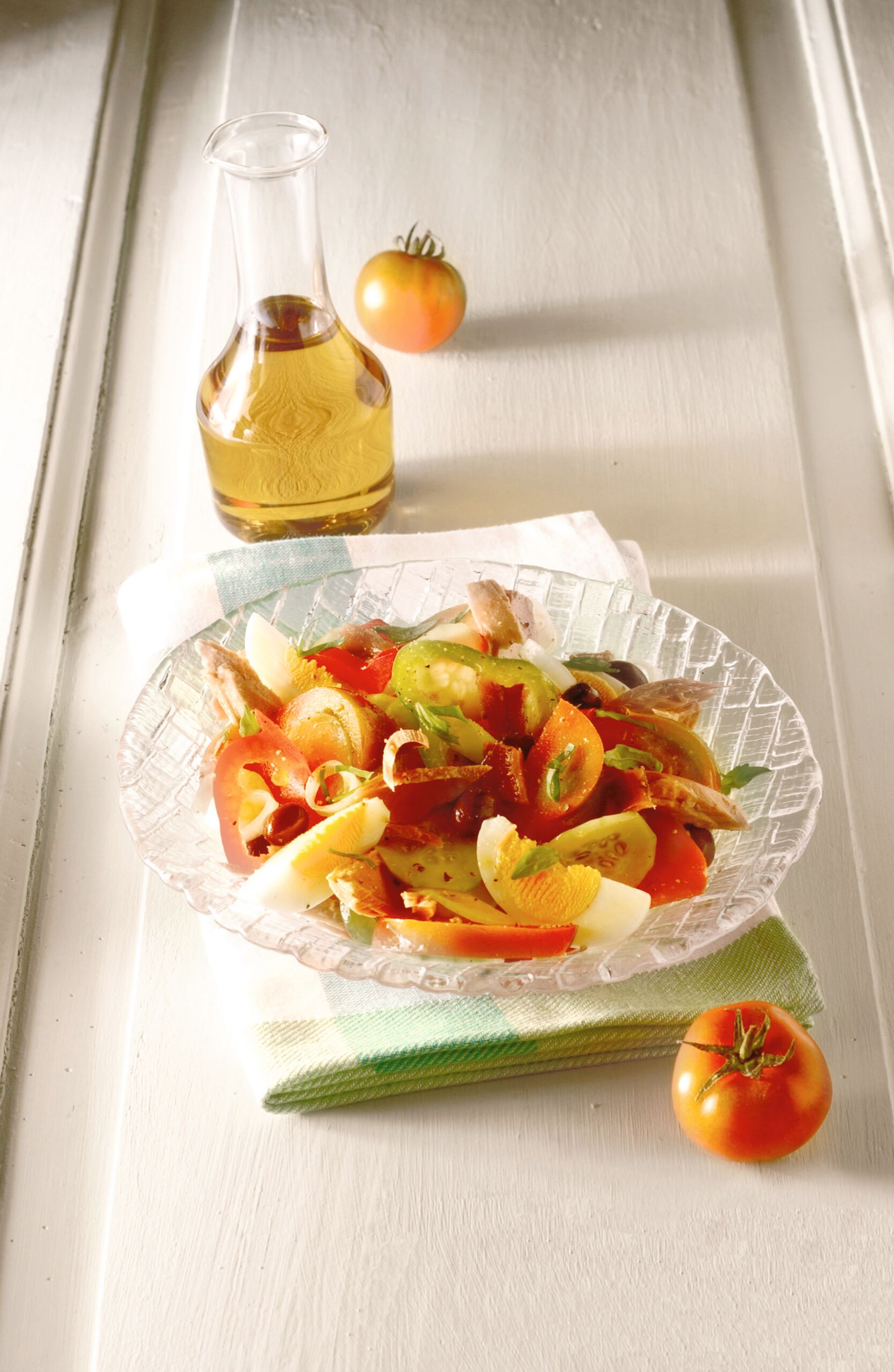 niçoise Niçoise Sale&Pepe editorial team Niçoise is the name of a famous French salad (in Italian it is called nizzarda) made with tuna, hard-boiled eggs, boiled potatoes, green beans, tomatoes, olives, peppers, cucumbers and anchovy fillets. salad vegetables french cuisine niçoise