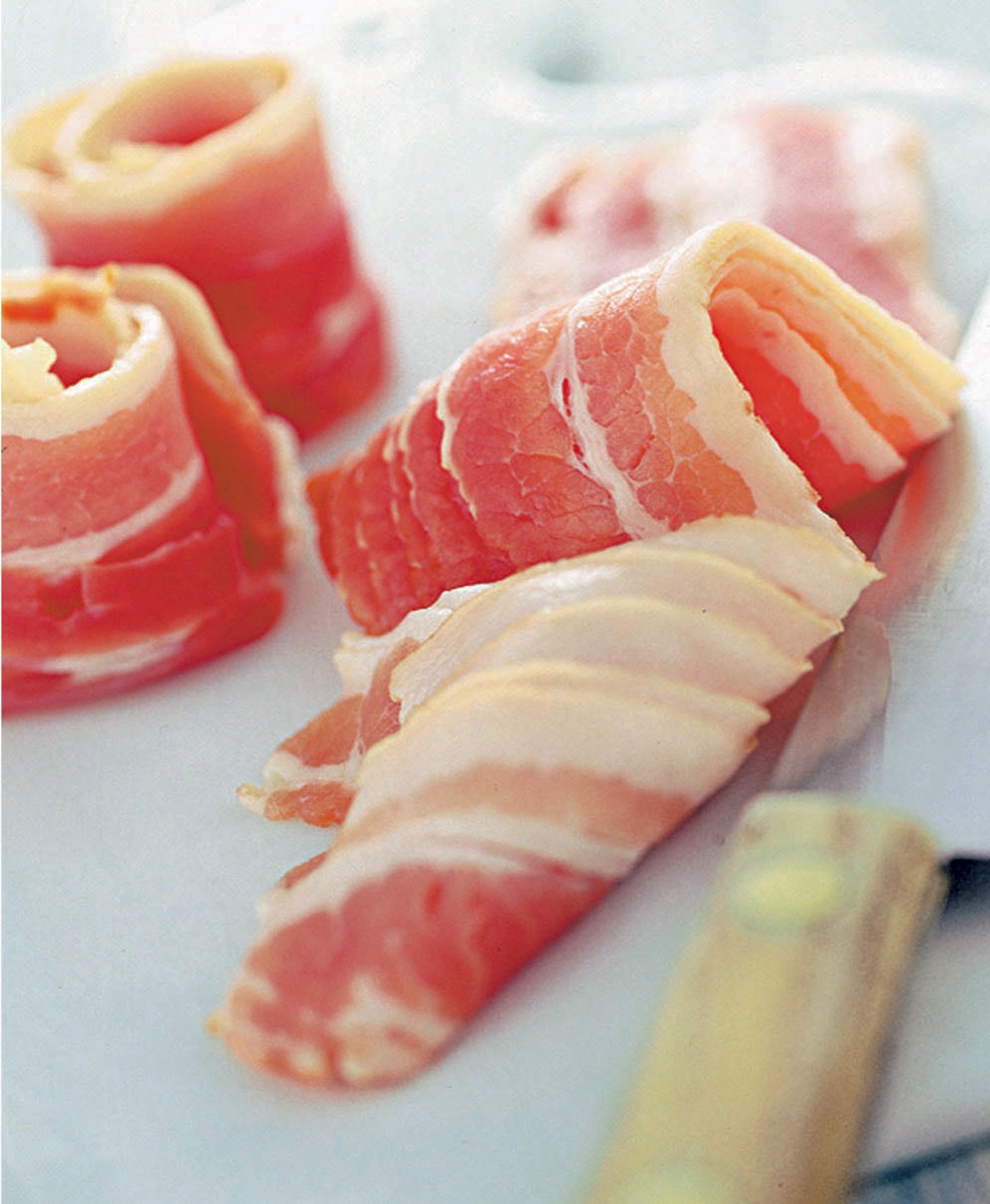 The stretched pancetta with rind, after being sprinkled with spices and aromas, can also be smoked , to obtain what in Anglo-Saxon countries is called bacon. For the best products, this phase lasts a few days with a process that uses aromatic woods and low temperatures. When cut, the pancetta slices are soft, with the typical red and white striped color and the unmistakable scent.