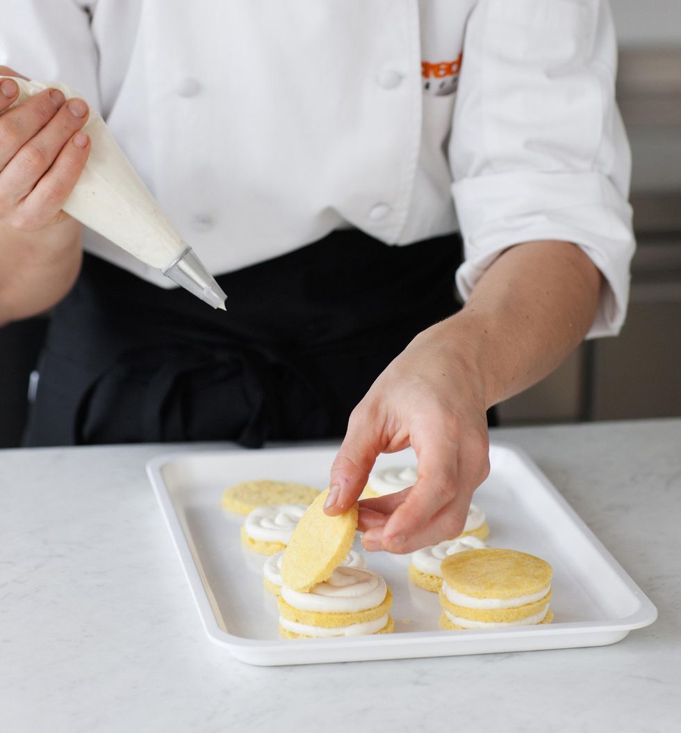 Cut in half the sponge cake, and stuff the base with the cream using a spatula to level. Let it rest in the fridge for 2 hours so that the cream will compact with the cake; then cut the cake in many rectangular or circular snacks, and garnish them with abundant powdered sugar.