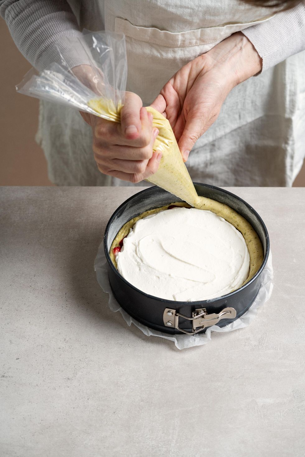 Finally, add the chopped pistachios and mix with a wooden spoon. Pour half of the mixture in the springform and level it with the back of a spoon.
