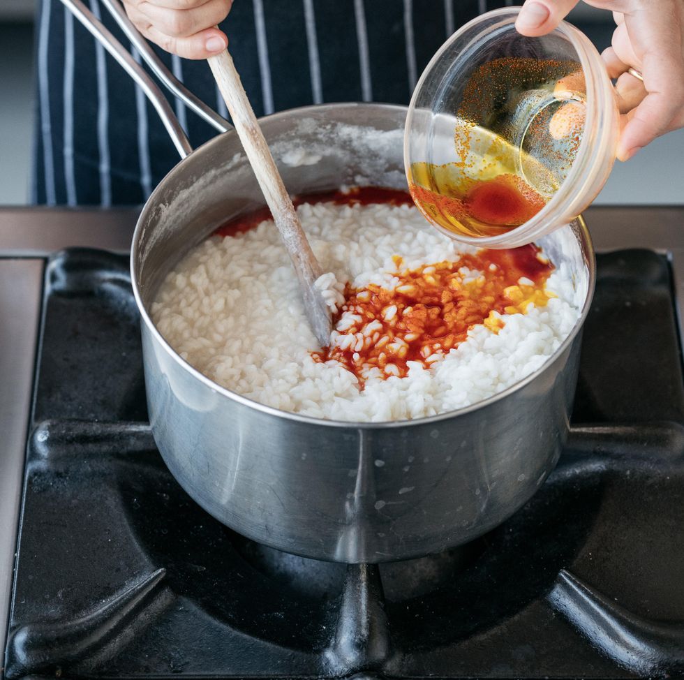 Transfer the rice on a tray, spread it out and let it cool (if you prepare it the night before, cover it with film so as not to dry).