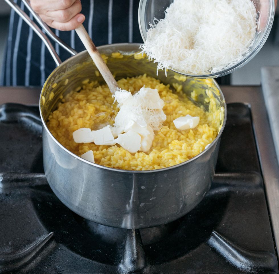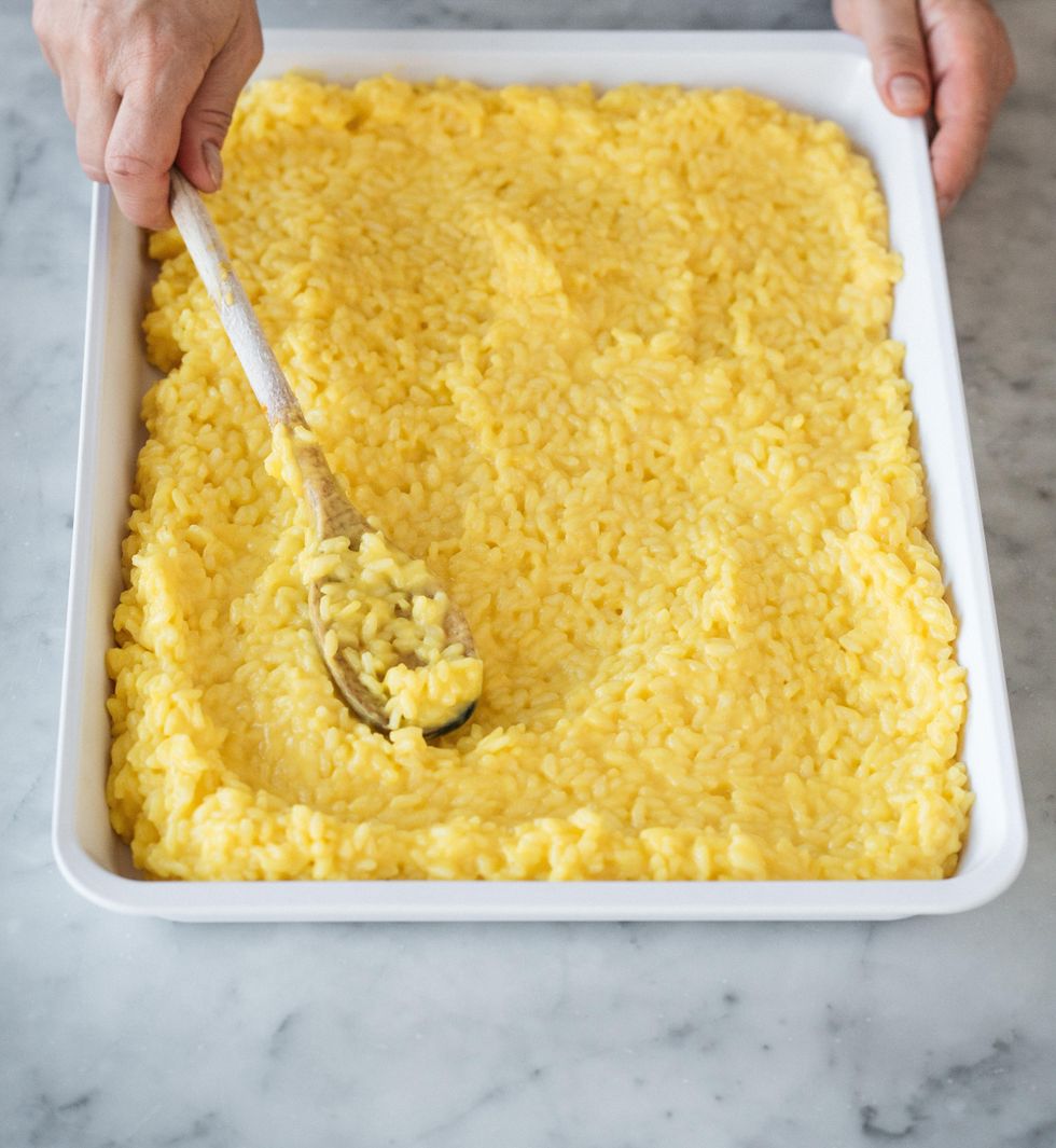 Prepare the rice arancini by boiling the rice in boiling salted water not too much, so that it is absorbed almost completely. About 5 minutes before the end turn off and add the saffron dissolved in a little water.