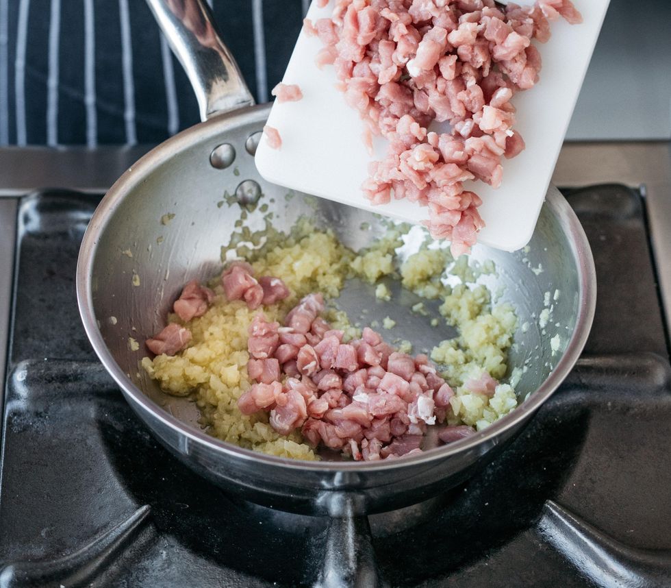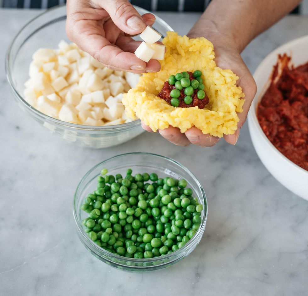 Take a few spoonfuls of rice and flatten it on your hand moistened with water; put in the center a little meat with its sauce, little peas, and a few cubes of cheese.
