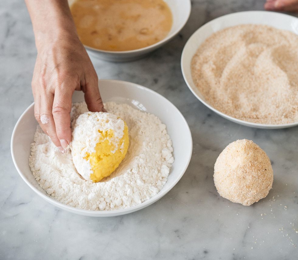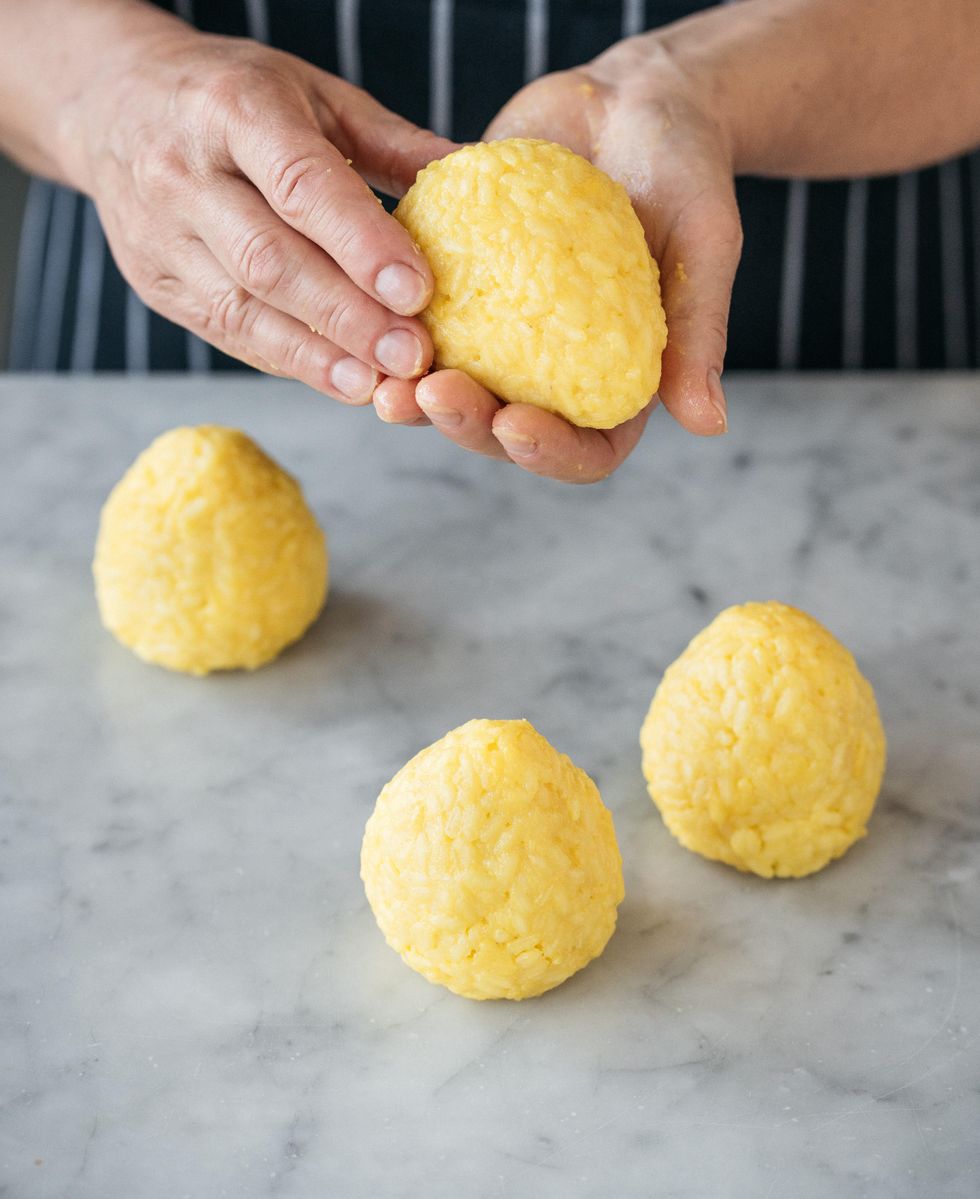 Close with another portion of rice and close the orange, turning it with both hands in a basin to compact it well, giving it the shape of a pyramid. Proceed in the same way with the other arancini.