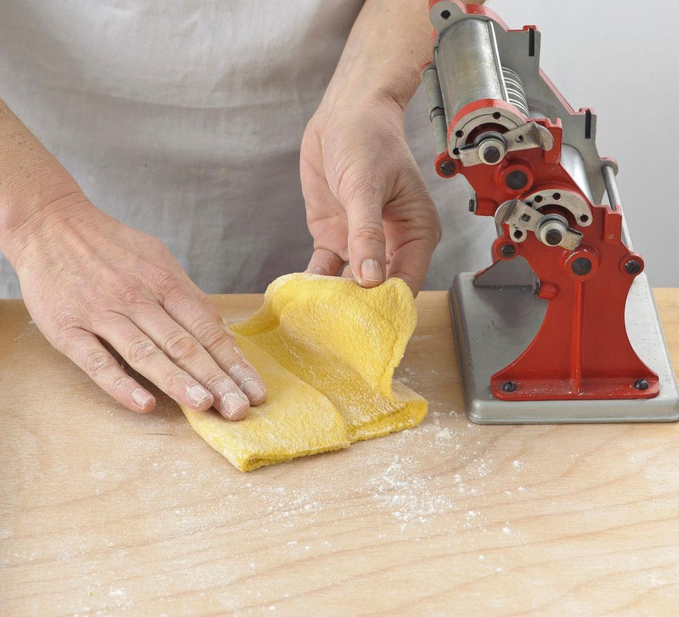 In the end, without bending it again, pass it back to the rollers up to a thickness of about one mm. Flour and cover the strip obtained. Proceed in the same way with the other pieces of pasta.