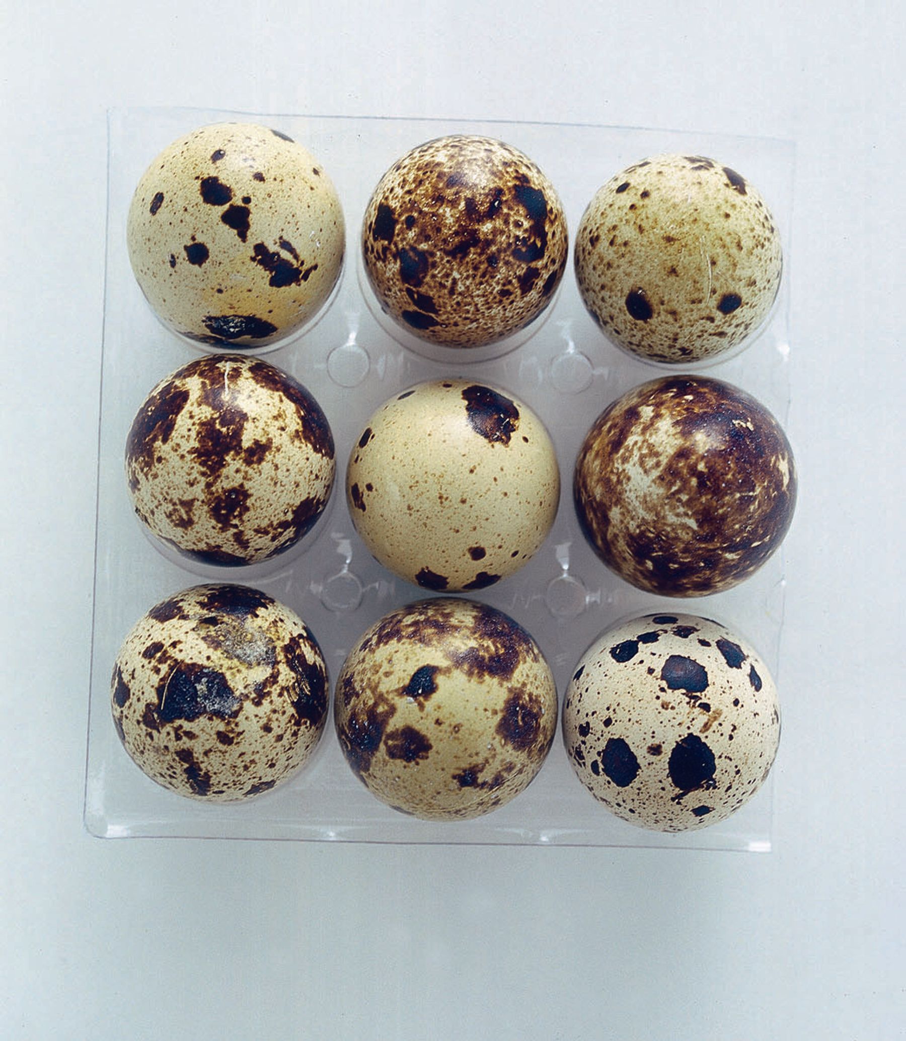 Smaller than those of hen (about 1/5) and of a milder taste, quail eggs have a dark flecked shell; they are produced all year round (on average 200-300 quail eggs) and sold in trays.