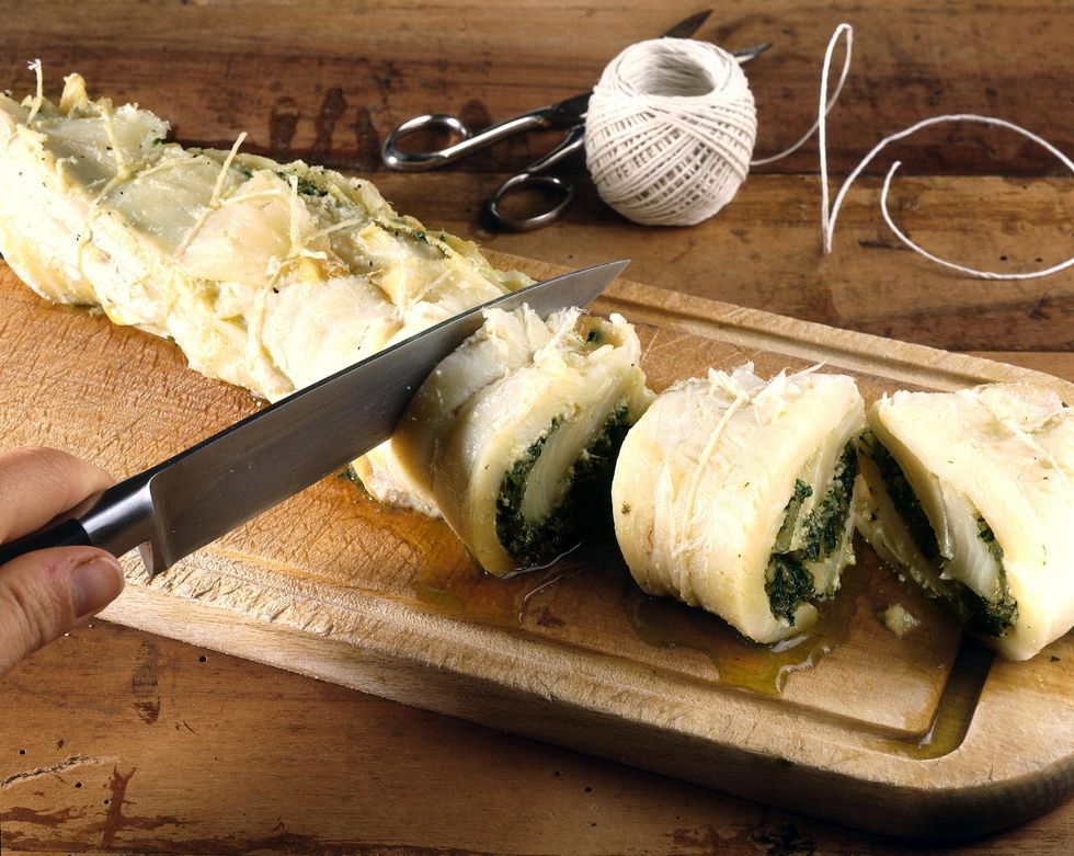 Bind the roll obtained in several points with single bindings, leaving between one and the other a space of about 2 ounces, then slice it with a knife, preferably serrated (to have more "grip" on the slippery pulp of the fish); when cutting, try to keep the ligature in the middle of each slice.