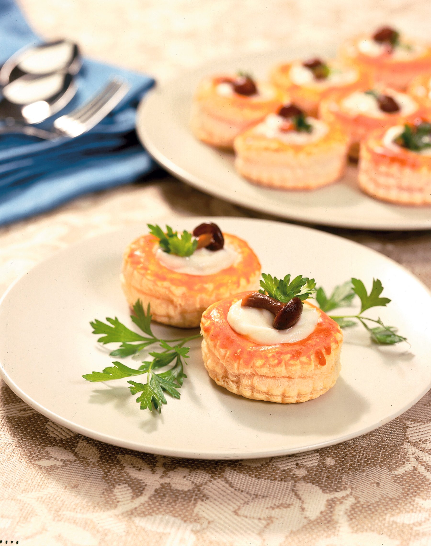 The vol-au-vent can be closed or not with a small lid and is stuffed with various types of fillings, both hot, as a finanziera, creams with cheese or ham, mushrooms, seafood, and cold such as caviar or savory creams (for example of smoked salmon).